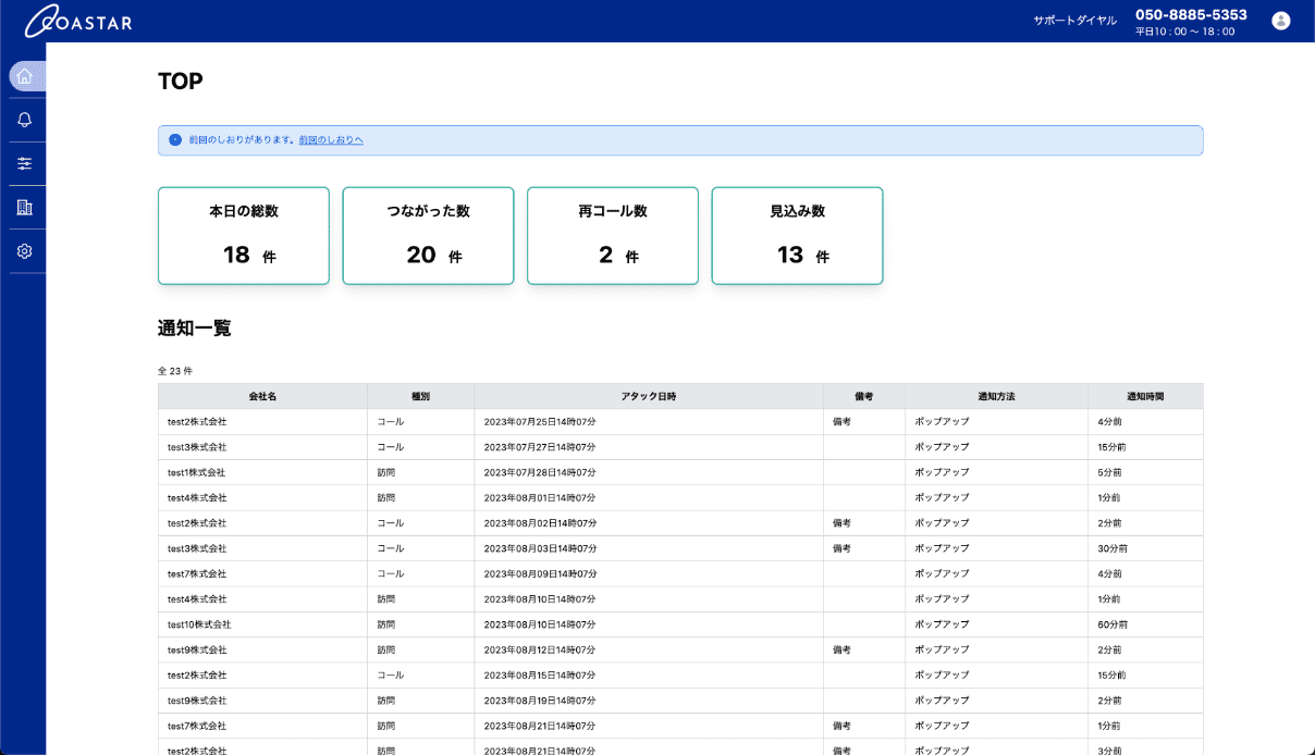昨日の続きからコールがしたい!という要望を叶えました。ログインしてすぐに架電開始できます。